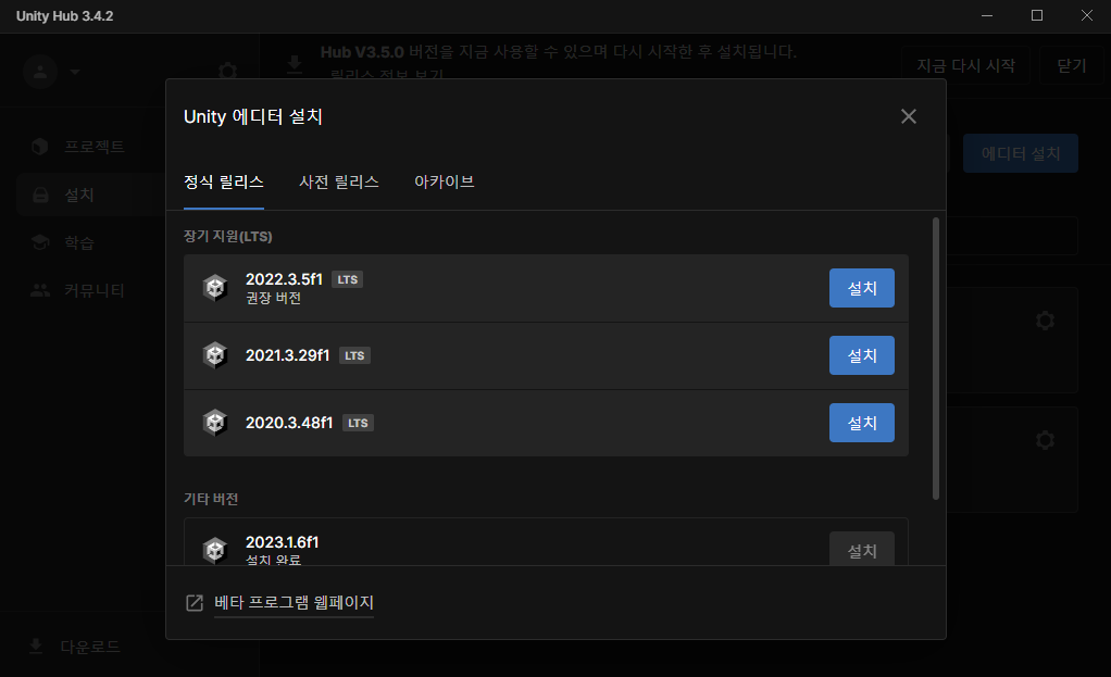 우선 유니티를 시작하기 위해 허브를 설치해주셔야 합니다.