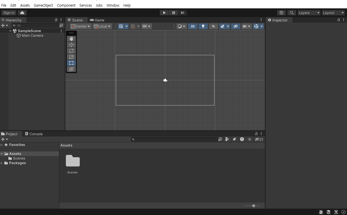 카메라 틀 화면과 밑에 에셋폴더에 Scene 폴더가 있는 화면을 보시게 되면 유니티 실행까지 끝입니다.