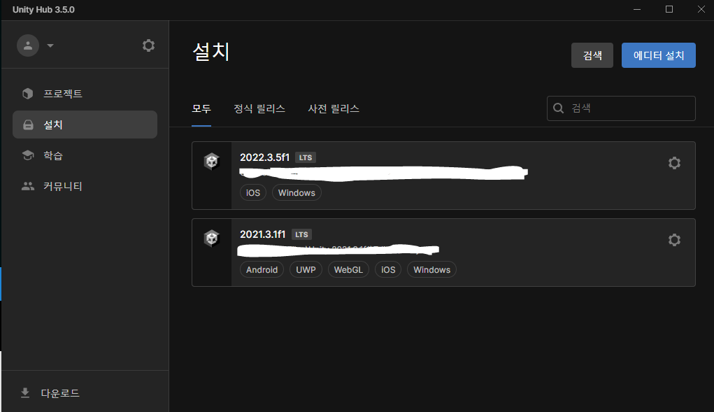 유니티 버전을 설치하는 건데 원하시는 버전 아무거나 설치하셔도 되지만 권장버전으로 설치를 해줍시다.
