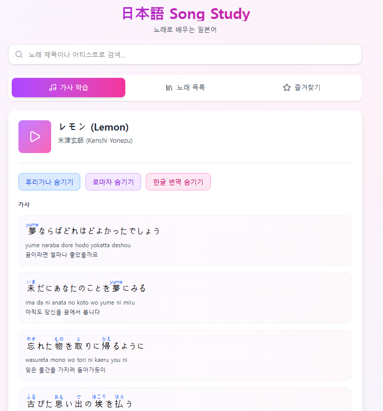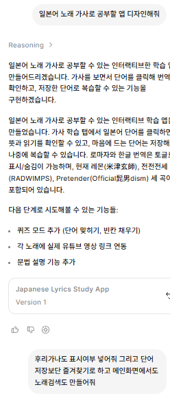 결론: 500곡까진 아니어도 노래 통째로 외워보려는데 일일이 찾기 귀찮음 -> "앱 하나 만들어서 AI한테 번역시키고 편하게 보자!"