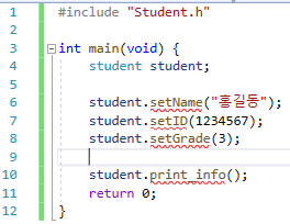 메인함수에서는 Student의 속성들을 메소드로 설정해주는 코드입니다.