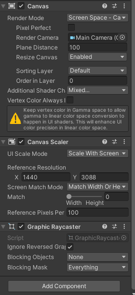 Casvas Scaler에서 UI ScaleMode를 Scale with Screen으로 해주시고