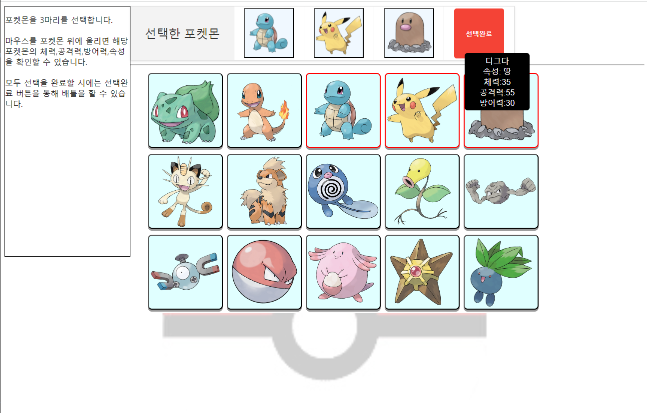 선택된 포켓몬의 버튼에는 빨간테두리로 표시를 하고 선택한 포켓몬을 취소하고싶다면 다시 그 포켓몬을 선택하거나 위에서 클릭하면 됩니다.