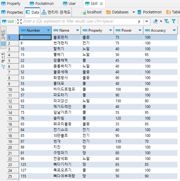 포켓몬의 속성별로 사용가능한 스킬들을 통일시켜주어 구현하였습니다. 스킬은 4개를 가지게되며 속성중에 5개의 스킬이 있으면 랜덤으로 4개를 넣어줍니다.