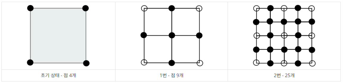 상근이는 친구들과 함께 SF영화를 찍으려고 한다. 이 영화는 외계 지형이 필요하다. 실제로 우주선을 타고 외계 행성에 가서 촬영을 할 수 없기 때문에, 컴퓨터 그래픽으로 CG처리를 하려고 한다. 외계 지형은 중앙 이동 알고리즘을 이용해서 만들려고 한다. 알고리즘을 시작하면서 상근이는 정사각형을 이루는 점 4개를 고른다. 그 후에는 다음과 같은 과정을 거쳐서 지형을 만든다. 정사각형의 각 변의 중앙에 점을 하나 추가한다.정사각형의 중심에 점을 하나 추가한다. 초기 상태에서 위와 같은 과정을 한 번 거치면 총 4개의 정사각형이 새로 생긴다. 이와 같은 과정을 상근이가 만족할 때 까지 계속한다. 아래 그림은 과정을 총 2번 거쳤을 때까지의 모습이다.