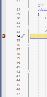 중단점에 노란색 화살표 모양이 생기며 중단점의 코드줄이 네모칸으로 표시됩니다